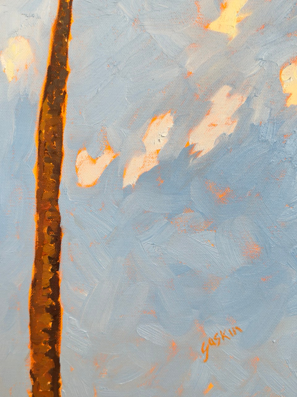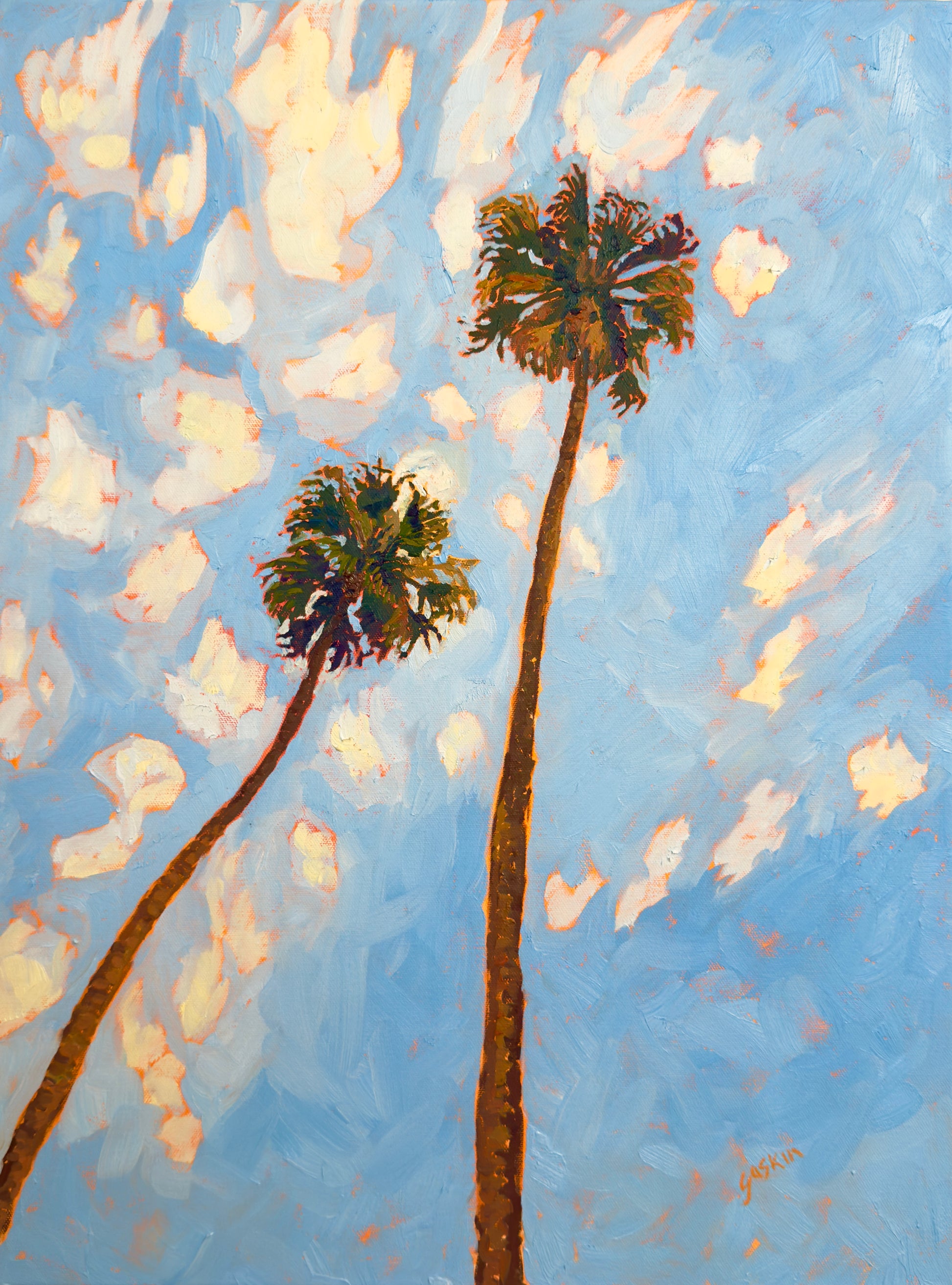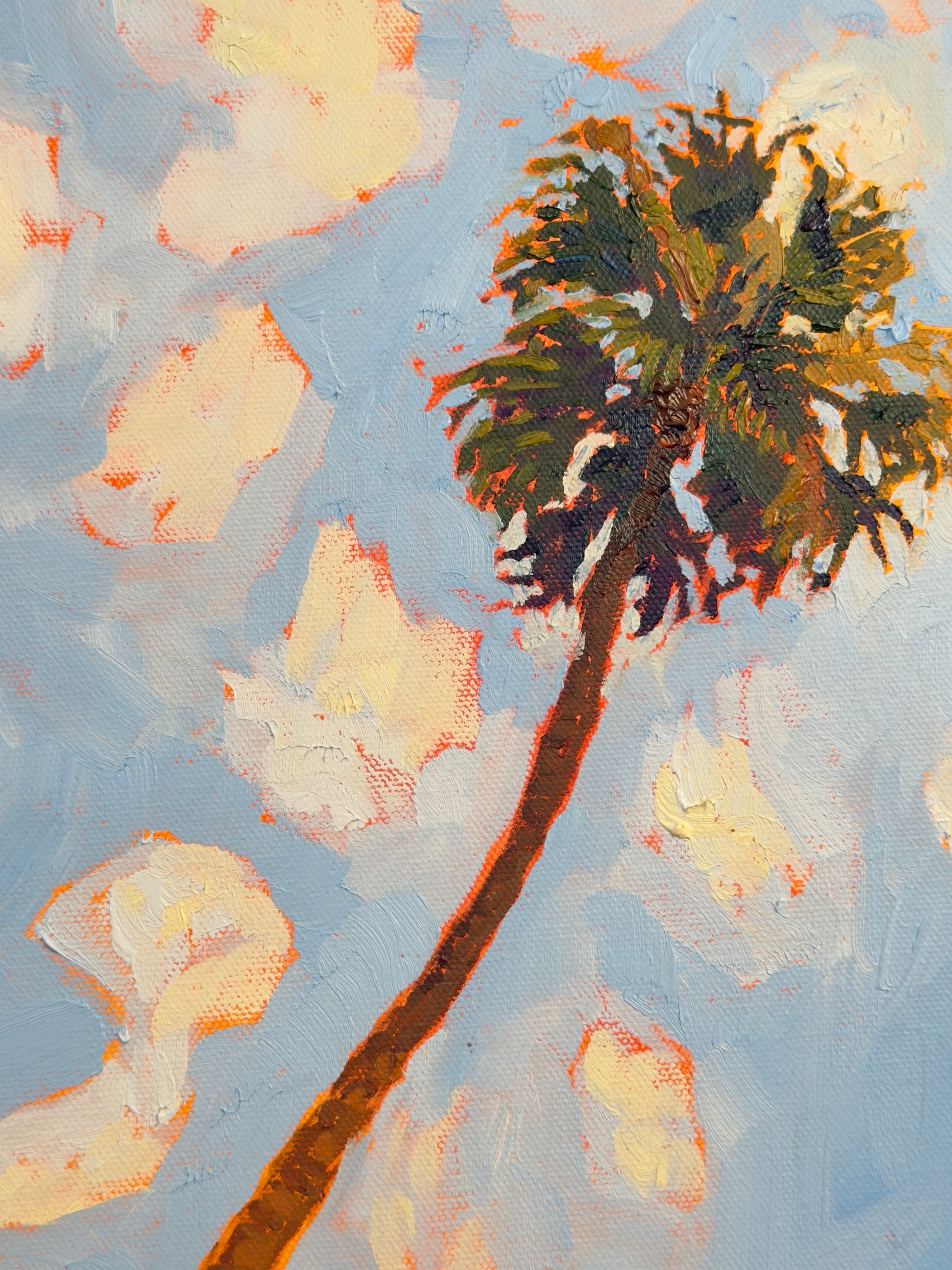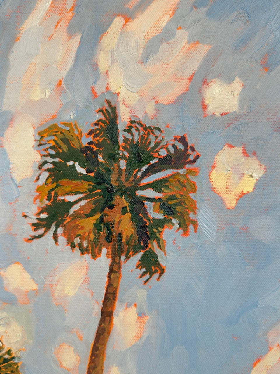 Hollywood Glow celebrates the iconic elegance of Los Angeles palms rising into a glowing sky. With luminous clouds drifting across soft blue, the painting captures the fleeting warmth of late afternoon light, when the city feels timeless and golden. Through bold brushstrokes and vibrant contrasts, this piece reflects both the beauty of California skies and the enduring allure of Hollywood’s landscape.