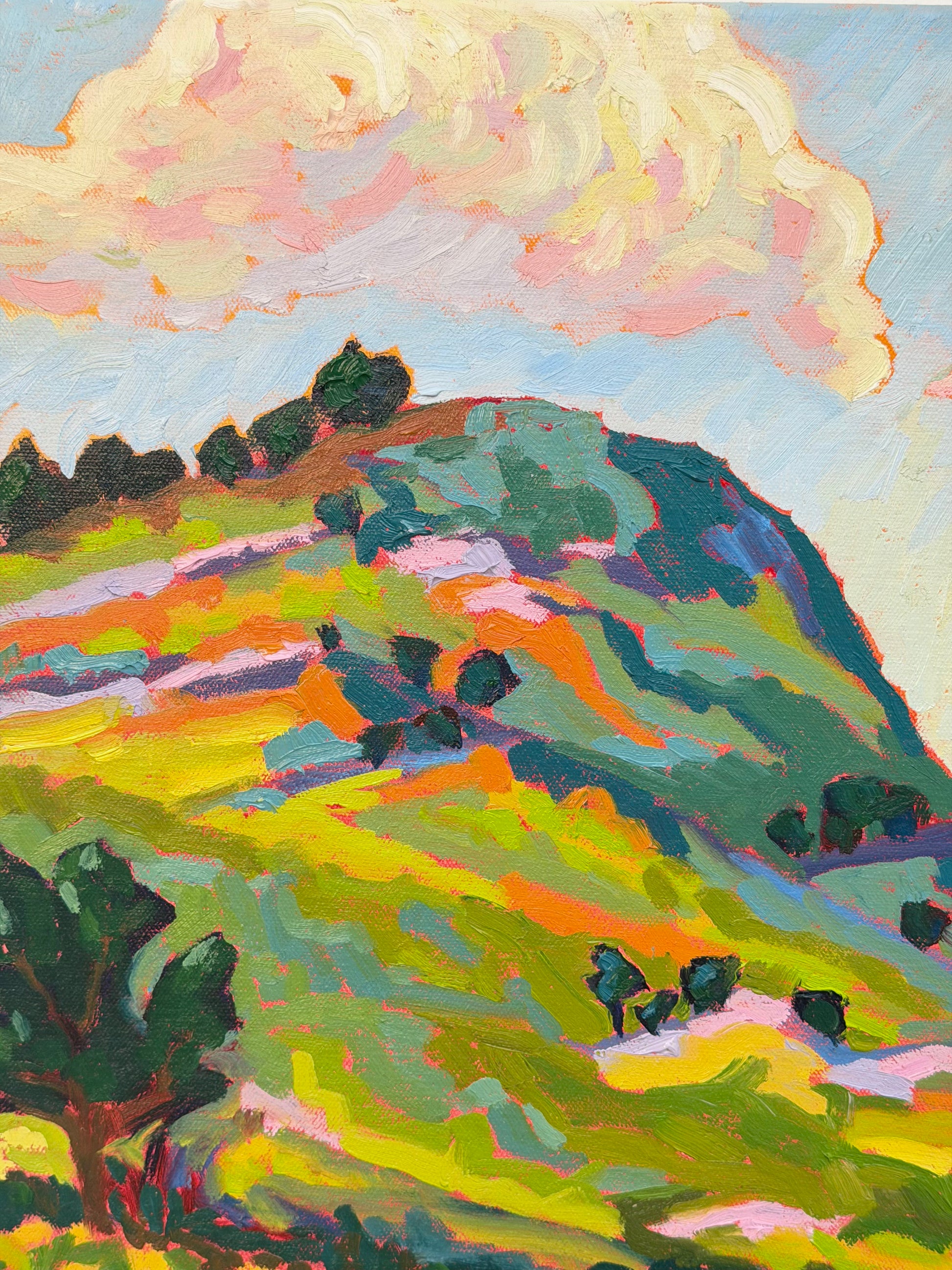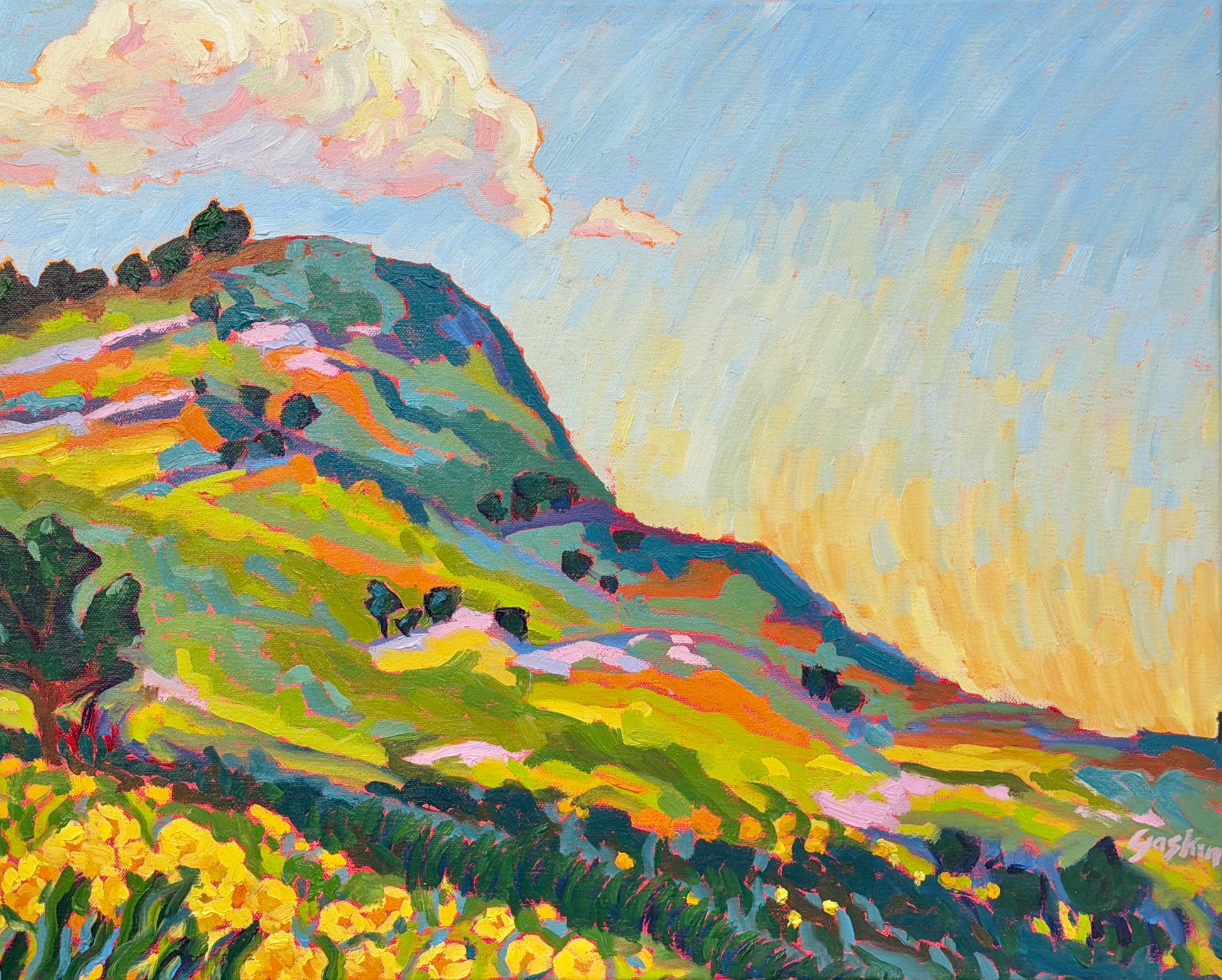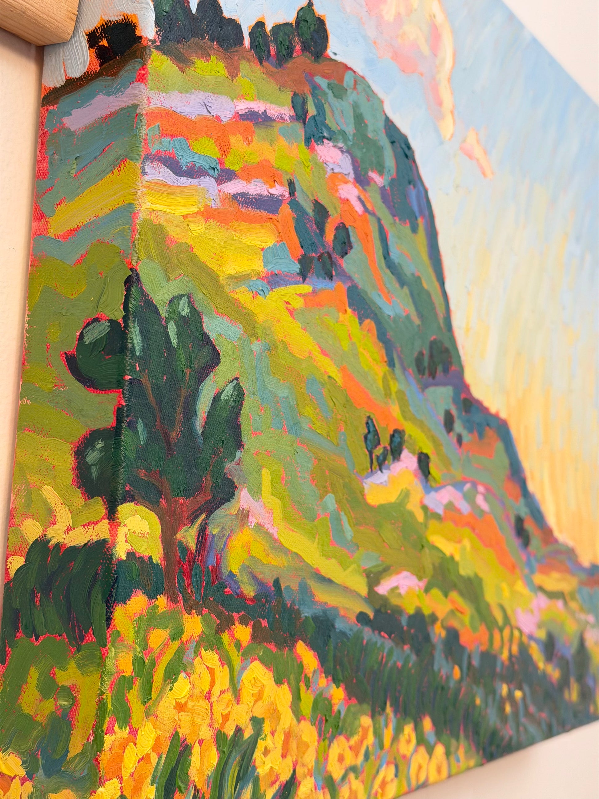 Striking depiction of the movement in the hills around San Fernando Valley, laced with vibrant yellow wildflowers. Inspired by the landscape while driving, the artist adds an extra element of movement in the sky so that you get the sense of traveling past, looking out with technicolor lenses on.